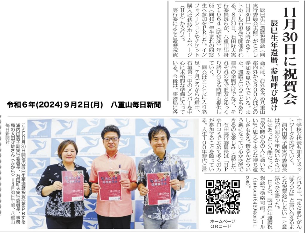 プレスリリース第1弾 2024年9月2日 最終更新日時 : 2024年9月2日 kanreki1964 還暦祝賀会の参加呼びかけのため、八重山毎日新聞社を訪問しました。9月2日(月)付け八重山毎日新聞に、実行委員の写真付きで大きく取り上げていただきました!このWebサイトのQRコードも掲載されましたので、アクセス訪問者数が、なんと半日で、イッキに100名を超え、スゴイ勢いで盛り上がってきましたよ♪ Follow me! FacebookXBlueskyHatenaCopy